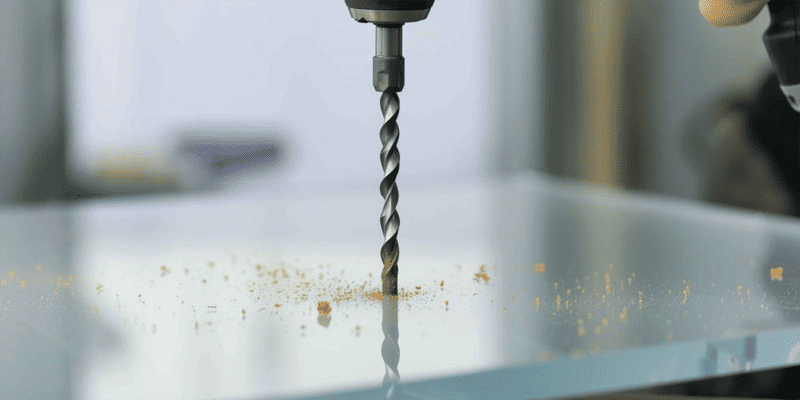Das Werkstück sollte möglichst auf der Unterseite mit Acrylglasresten oder Hartholz unterlegt werden. So lässt sich eine Splitterbildung beim Durchtritt der Bohrerspitze verhindern. Das Material darf nicht mit einem Körner oder Dorn angekörnt werden, da dies Spannungen erzeugt und zu Rissen führen kann. Stattdessen sollte ein kleines Führungsloch vorgebohrt werden.
