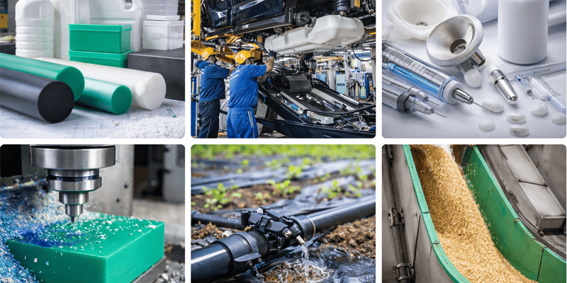 Typische Einsatzbereiche für PE-Werkstoffe finden sich in der Industrie, im Maschinen- und Anlagenbau, in der Fördertechnik, im Behälter- und Apparatebau sowie in der Lebensmitteltechnik. Auch in der Agrartechnik, im Fahrzeugbau oder in chemisch anspruchsvollen Umgebungen kommt Polyethylen regelmäßig zum Einsatz.